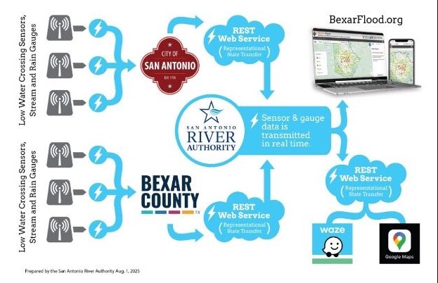 This chart shows how a next-generation flood warning system functions between San Antonio River Authority, Bexar County and city of San Antonio resources. (Courtesy of the San Antonio River Authority)