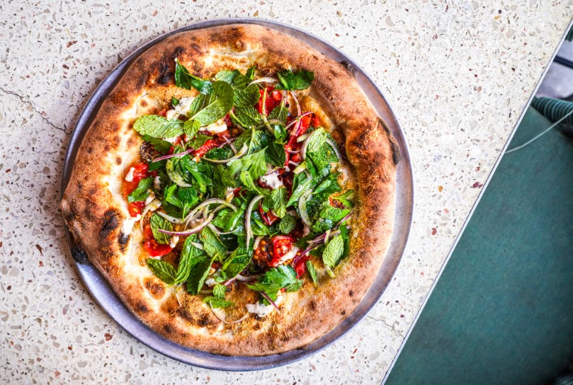 The February pizza collaboration features Sujuk sausage layered with Kefolatyri cheese, roasted and marinated tomatoes, red onion and herbs, finished with a drizzle of pomegranate molasses and Skhug vinaigrette.