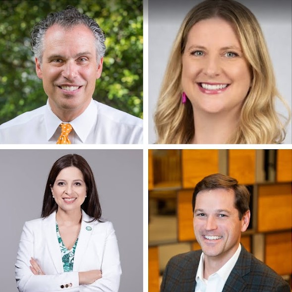 Lindsey Saldana (clockwise from top right), Hunter Kingman, Bianca Cerqueira and Ty Edwards are vying for two Alamo Heights ISD board posts. (Courtesy photos)