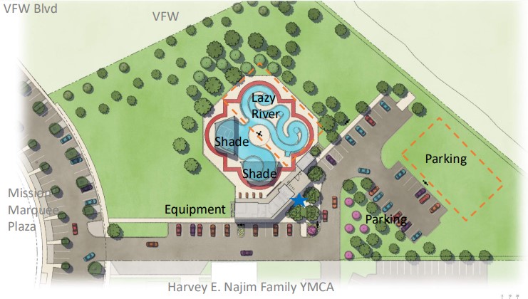 Funded by the city’s 2022 voter-approved bond, the $5 million aquatics facility will be located at the Mission Marquee complex – specifically, a vacant parking lot supporting the former Mission Drive-In, which now sits next to the Mission Library, World Heritage Center, and the Najim YMCA.